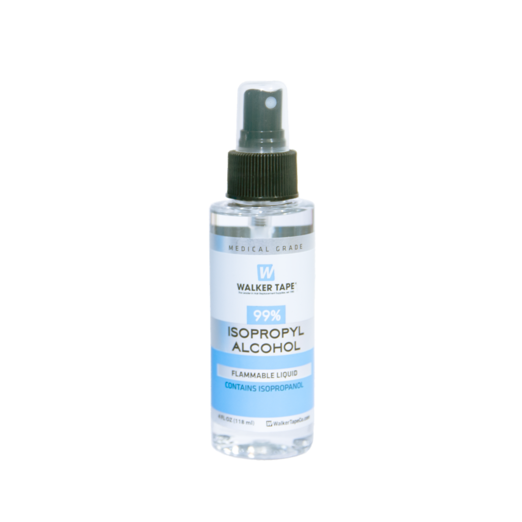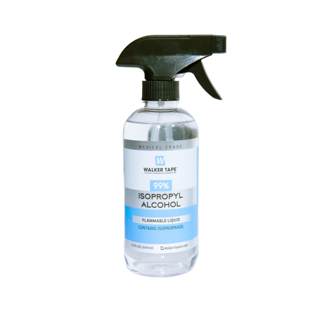 99% Isopropyl Alcohol reinigt het haarwerk en de hoofdhuid van stof, vuil, olie en dode huidcellen. Zonder 99% alcohol blijven lijmen en tapes meer aan de oliën en stof plakken in plaats van aan de hoofdhuid.